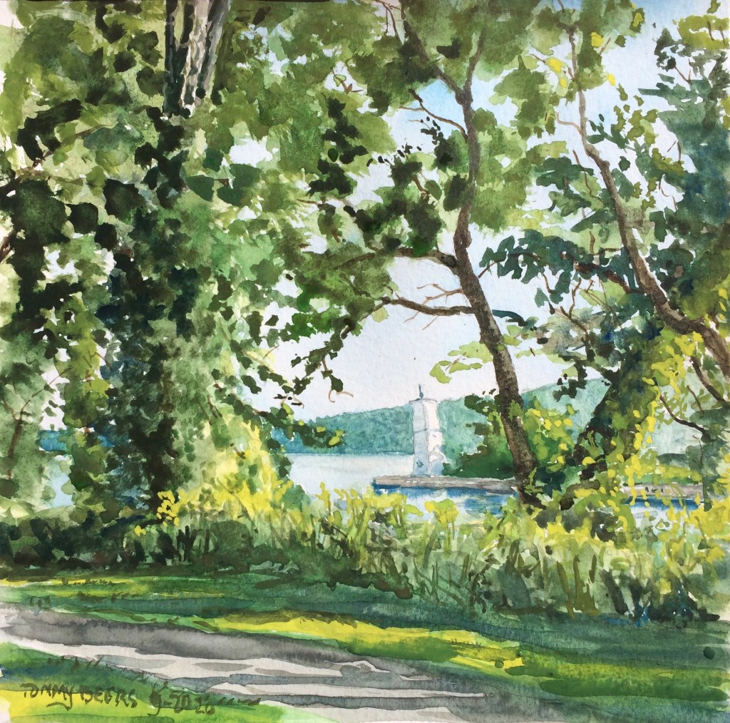 I went down to the inlet early this morning to catch the light and shadows and it didn’t disappoint. Here’s a plein air piece done sitting on a bucket. it’s lively. Lots of dog walkers and cyclists out today. Gonna be another beautiful one. This is 8″ x 8″ using pencil and watercolor on cotton paper.