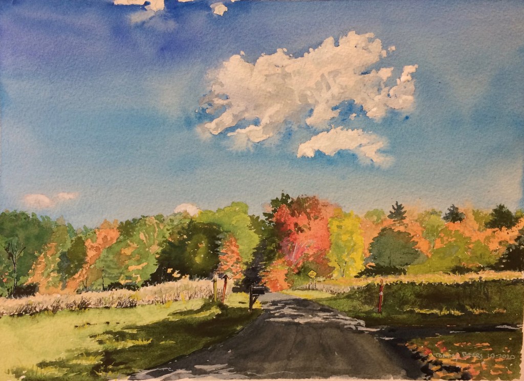 I went to pick up some minnows yesterday to feed the bass we’ve just added to our aquaponics system. Last winter we lost all our tilapia to Ick, a fish disease that they’re prone to. Trying bass this winter but they are carnivorous, hence the minnows. Anyway, driving home on back roads I come upon these glorious trees…knock out colors. This is just south of Lick Brook Glen. It’s 9″ x 12″ using pencil, watercolor and gouache on cotton paper.