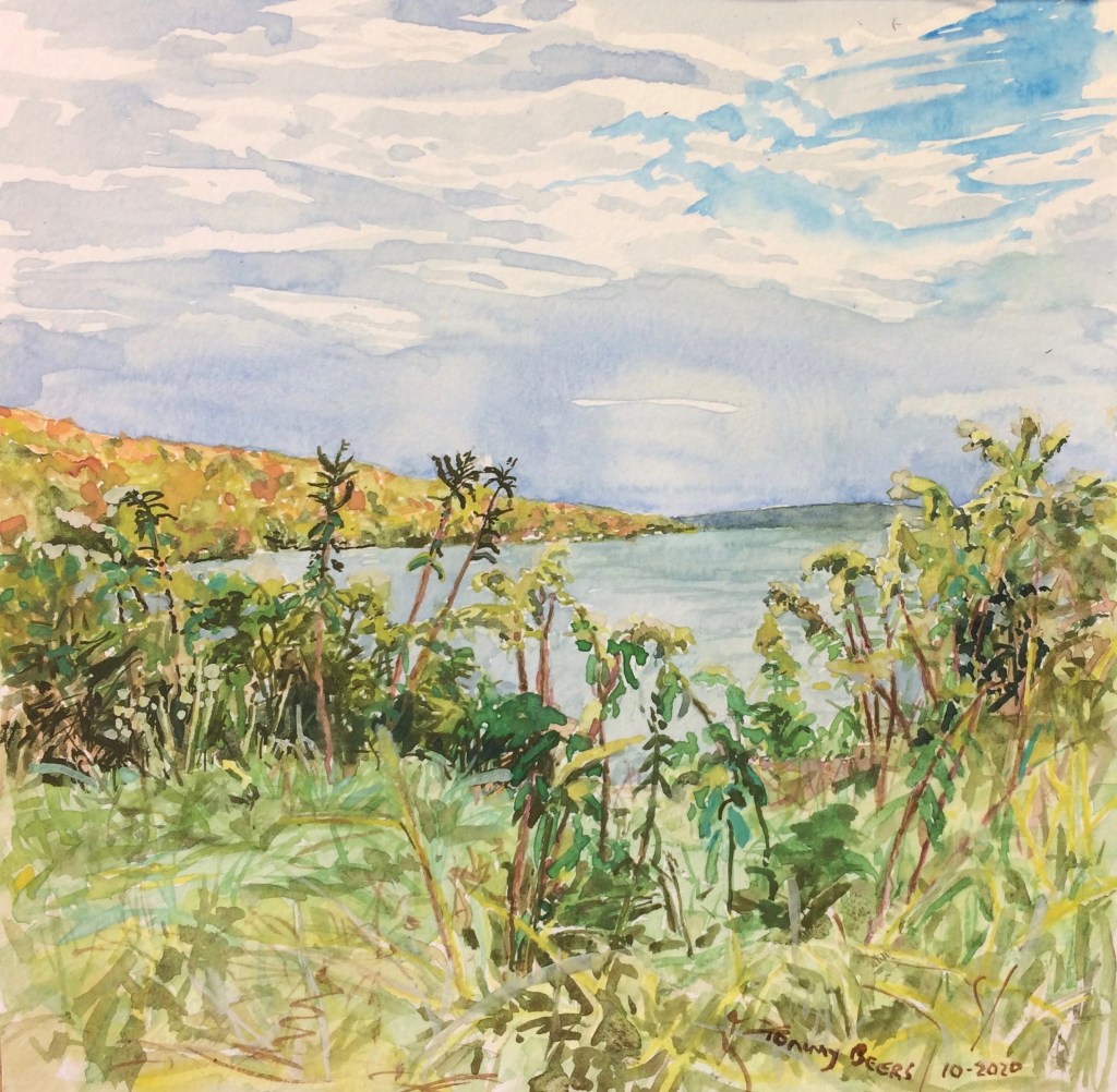 Another walk down by Cayuga Lake yesterday and this is what the weeds are looking like as we ease into the winter season. The goldenrod has lost its gold but the trees compensate for it masterfully. Soon it’ll all be gone. This is 8″ x 8″ using pencil, watercolor and gouache on paper.