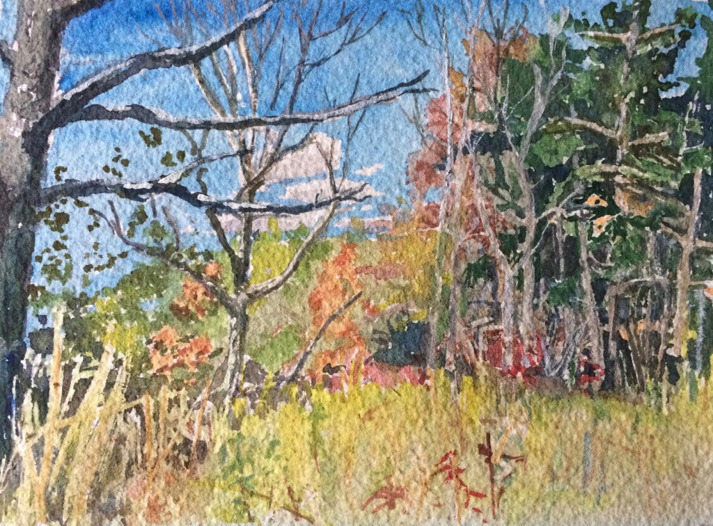 I went out once again to “Connecticut Hill” and rambled along unmarked woods, deer paths and old logging roads. ‘Twas a lovely day and most satisfying in many ways. Now, to share these walks with others will be especially nice. I came out of the woods and there was this small field, quite overgrown with goldenrod. The leafless oaks added dramatic effects through no fault of their own. They do what they do best. It’s 4″ x 6″ using pencil and watercolor on cotton paper.