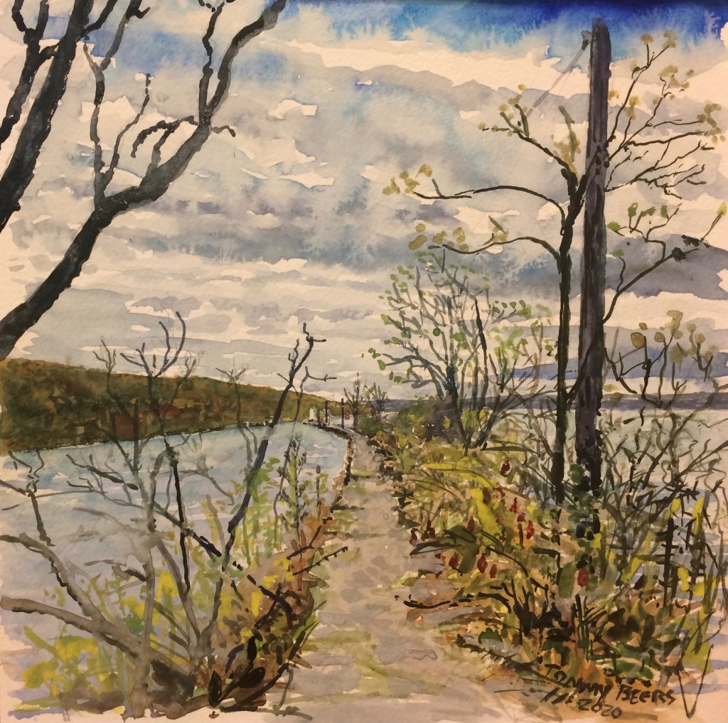 The first of November and I’m out by the lighthouse at the foot of our lake. It’s very windy and gray with some color still clinging to various trees and shrubs. There’s not a lot to say about this. I’ve done the lighthouse from the shore any number of times so this is a first out here. It’s 8″ x 8″ using pencil, watercolor and gouache on paper. SOLD