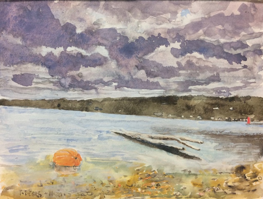 Taking a walk along our lakeshore a few days ago we find a pumpkin stranded in the shallows. there’s been a north wind blowing of late so it may well have come from one of the many docks along the western shore. It was a gray day so a little color is OK. Post Christmas there’ll be evergreen trees landing on the shoreline. So I guess pumpkins float. It’s 6″ x 8″ using pencil, watercolor and gouache on paper.