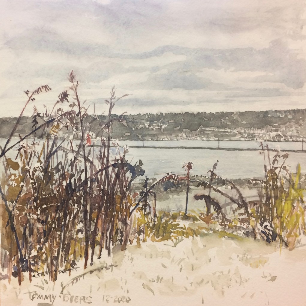 We’ve had some snow around here. This is our lakeshore once again. It’s just an interesting place to walk, much better than the streets with all the traffic. And these days we’ll be using a limited palette. It’s 8″ x 8″ using pencil and watercolor on cotton paper.