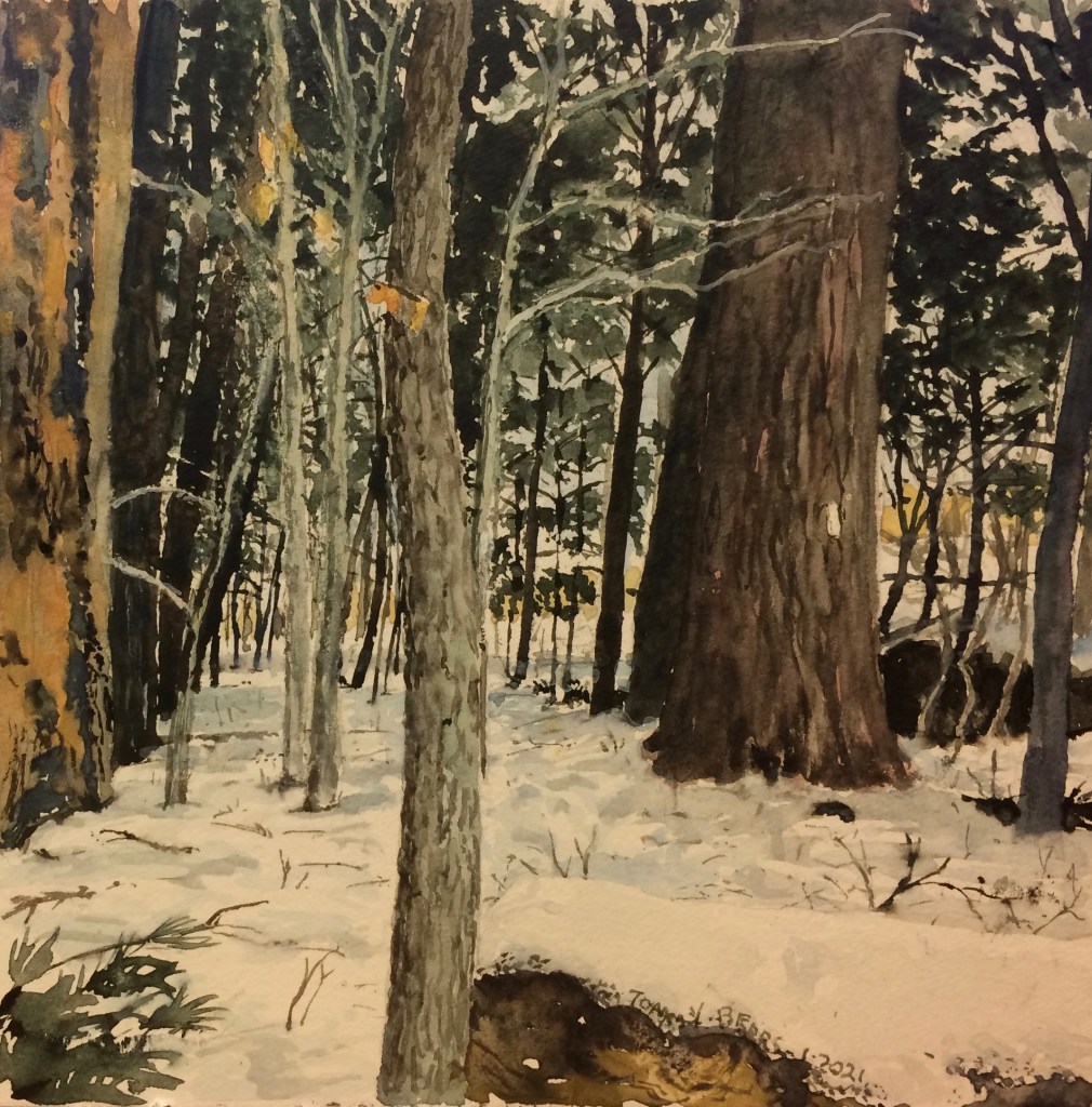 Sunday morning I went out with my friend John Suter and we hiked a section that goes from the McCormick Center down to old 76. It’s a nice section of woods and crosses a lovely creek. At the crossing there were some very sizable pine and hemlocks, this being but one of them. Walk south on Old 76 to Smith Rd. and return to your vehicle on South Rd. It’s a nice loop and the returning via unplowed roads affords one the opportunity to have a decent conversation which we certainly did. This is 8″ x 8″ using pencil, watercolor and gouache on cotton paper.