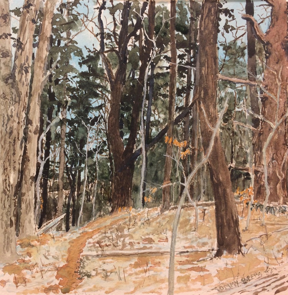 Margot and I went out again yesterday along a section of the FLT above the Treman Park gorge. I love this trail up here. We walked in on the regular gorge trail on the South side and then cut up to the FLT to make a loop that returned us to the parking lot. Maybe 3.5 miles in total but there was some serious hill climbing involved. At this spot there’s 3 huge white pines, a steep drop to the gorge to the left and open fields to the right. It’s got everything. I blued the sky too. It’s 8″ x 8″ using pencil, watercolor and gouache on cotton paper.