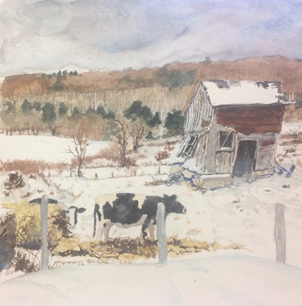 On Friday, yesterday, i walked with Carla along a section of the FLT. To return to the car in a loop we walked along Old 76 and these fine young animals were out and about. Recently we’ve had some flurries and the fields were nicely delineated. Gray days but still a lot happening. It’s 8″ x 8″ using pencil, watercolor and gouache on cotton paper.