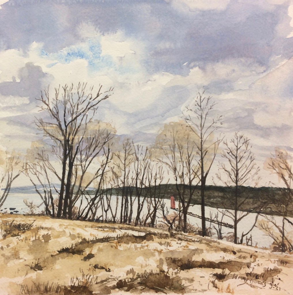 Yesterday afternoon I walked down by the lake again. Snow is melting and the willows are beginning to show some spring color. There was a little patch of blue sneaking thru the clouds. This is 8″x 8″ using pencil and watercolor on cotton paper. $65 Unframed