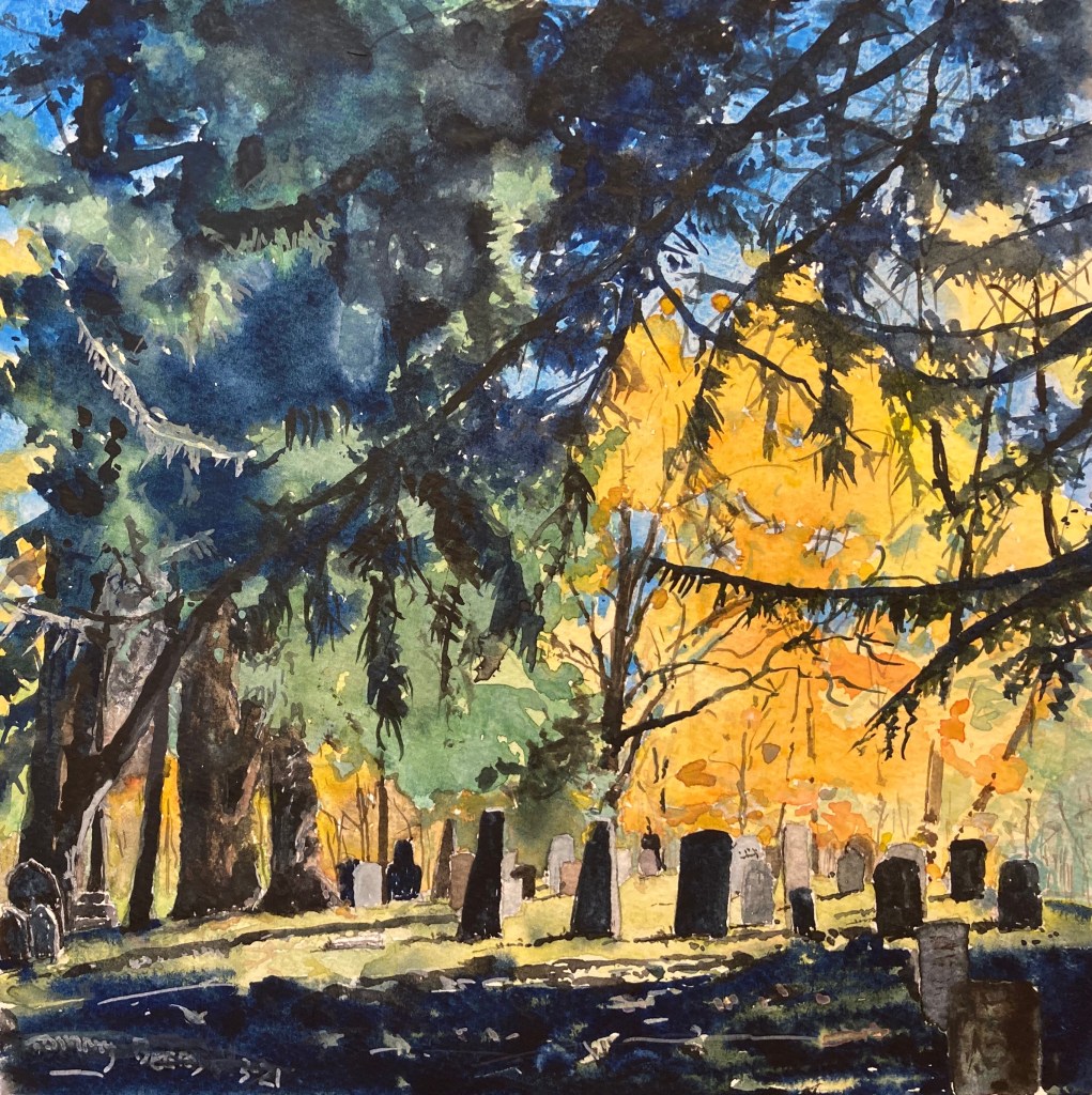 This is a sweet little, very old cemetery off Perry City Rd. I think it was of a Methodist persuasion. It’s not the Quaker one. Anyway the light last fall was exquisite. I’ve been waiting to try to capture it for awhile and here’s my attempt. It’s 8″ x 8″ using pencil, watercolor and gouache on cotton paper. $65 unframed