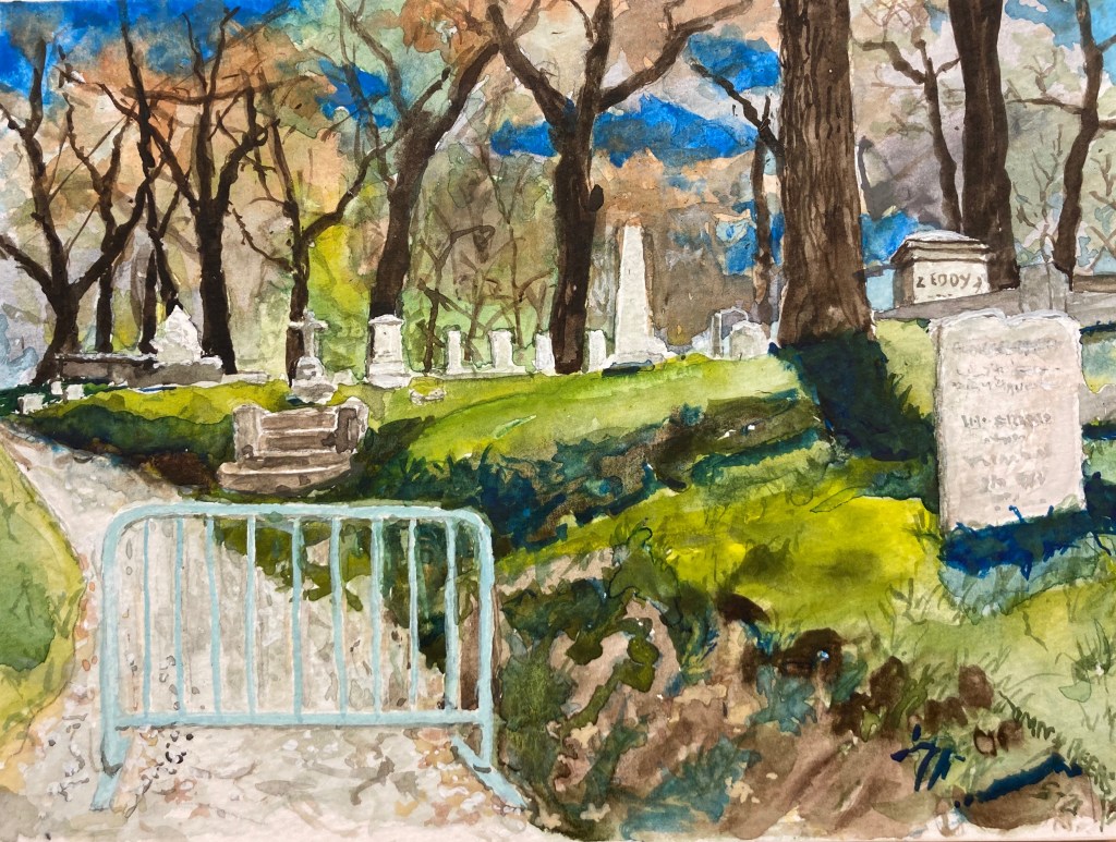 Today I went to Rochester to take Maggie to a dental appointment. I visited this famous cemetery and painted some of the stones and hills contained therein. Susan B. Anthony and Frederic Douglas are two of the headstones here.