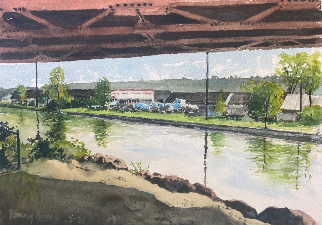 May 26, 2021May 27, 2021 Close to Home #78 Another view of our inlet. I like the bridgework. This is 7″ x 12″ using watercolor, pencil and gouache on cotton paper. $85 Share this: Click to share on X (Opens in new window) X Click to share on Facebook (Opens in new window) Facebook Like Loading...