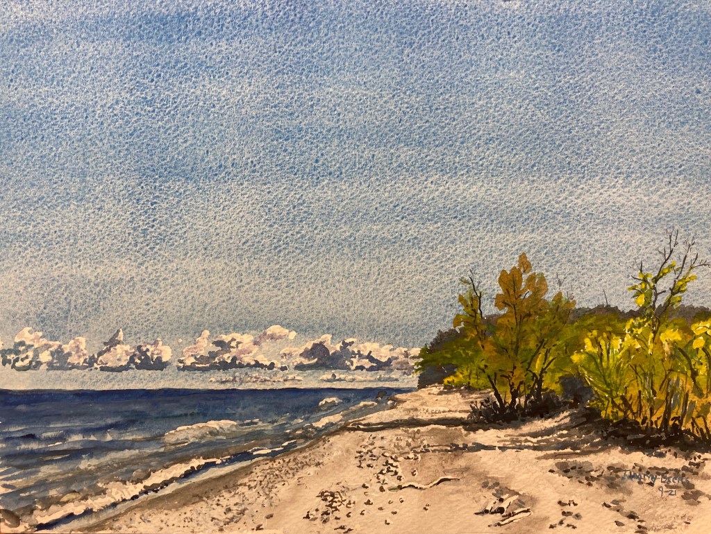 The family visited Fairhaven Beach State Park 2 weeks ago and it was gorgeous weather for one of the days there. We walked north of the park along the shore and this is the deserted beach. Beyond are cliffs of clay and sand, quite impressive when you walk along the shore. It’s almost like being at the ocean, the lake is so big, but it’s all fresh water. This is 9″ x 12″ using pencil, watercolor and gouache on cotton paper. $ 125 unframed.