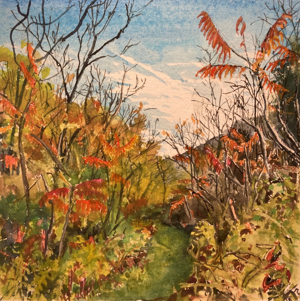 Still walking the dogs thru some seriously damp fields and woods. Here’s a little vignette of sumac along one of the trails at the preserve. We had wonderful conversations and parted full of gratitude for the bounties bestowed on us out there. It’s 8″ x 8″ using pencil and watercolor on cotton paper. $ 60 unframed
