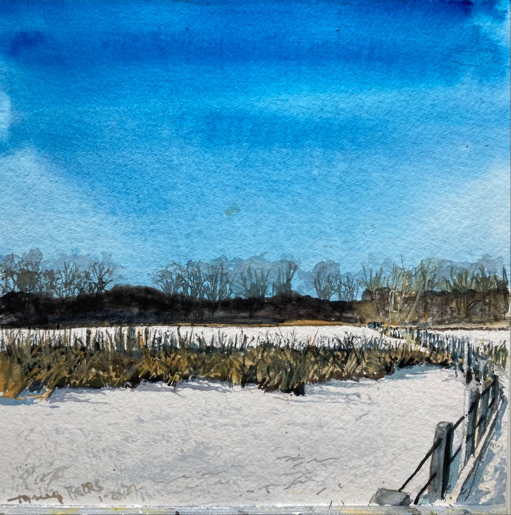 It’s -4 degrees here and has a windchill factor of minus 25degrees. Rough! This frozen lake will be teeming with wildfowl in few months though. It’s 8″ x 8″ using pencil, watercolor and gouache on cotton paper. SOLD for $ 65 unframed
