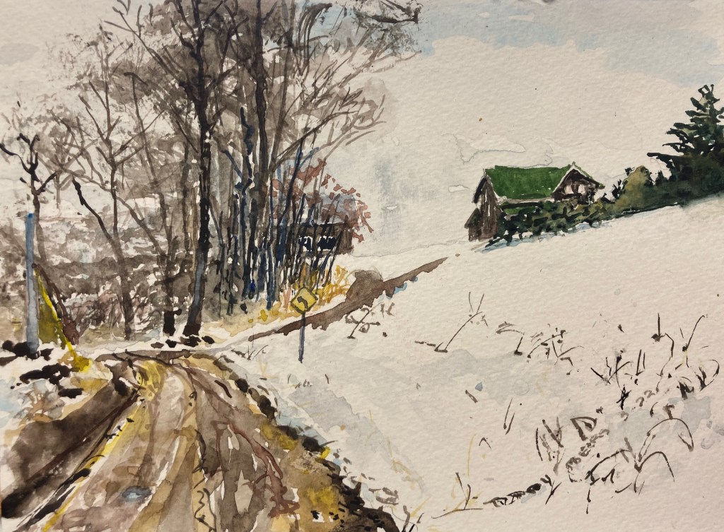Here’s a small plain air piece. It got warm around here so I headed out. This is Curtis Rd. just past where it crosses Hill Rd. lovely little farm fields at the top of the hill. It’s 6″ x 8″ using pencil and watercolor on cotton paper. $ 65 unframed
