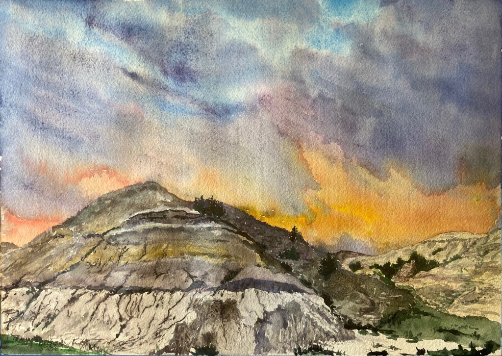 This was the morning greeting in Makoshika State Park, a not so grand canyon in Eastern Montana. One could drive right into the camping grounds here inside the canyon walls. It was a pleasant stop. This is 10″ x 14″ using pencil and watercolor on cotton paper. $ 125 unframed
