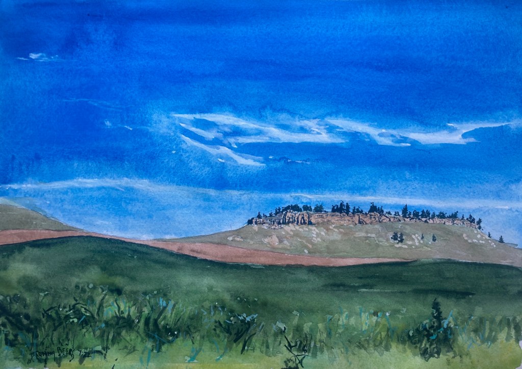 July 9, 2022October 20, 2025 Roadside Attraction # 45 GIFTED Driving to Colstrip Mt. on the road from Lame Deer you pass many buttes and mesas. It’s remarkable scenery. Here’s an attempt to reproduce that wonder and awe. This is 10″ x 14″ using pencil, watercolor and gouache on cotton paper. Share this: Share on X (Opens in new window) X Share on Facebook (Opens in new window) Facebook Like Loading...