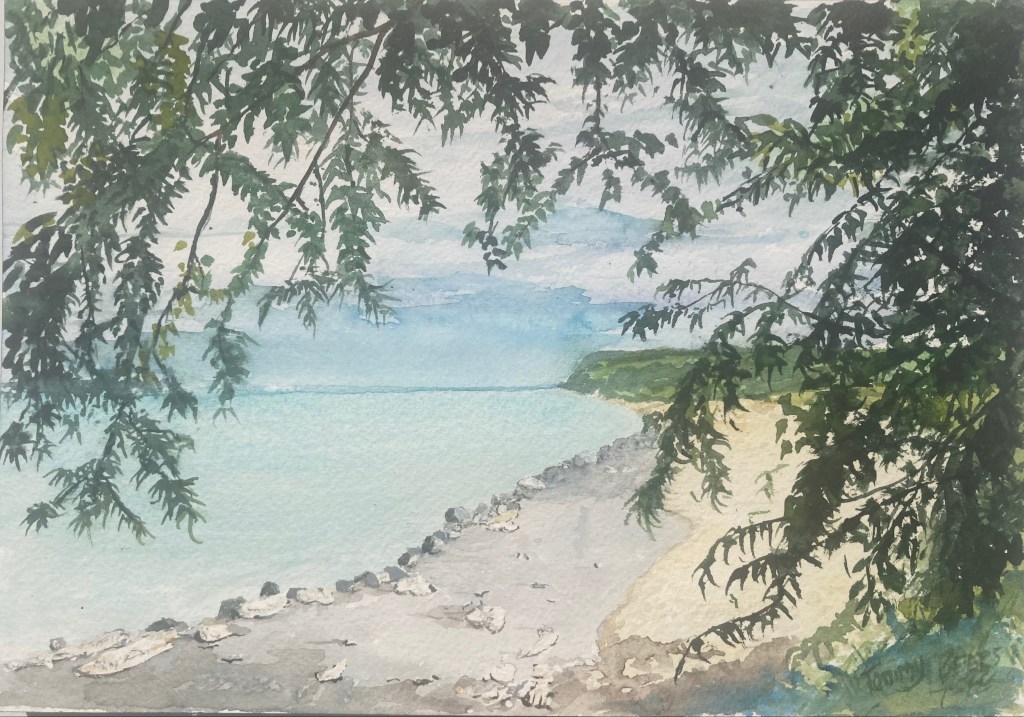This is a little beach above the official swimming area. Once again the water’s color had changed. This park is a premier spot in NY state. The swimming area has a most wonderful sandy beach. There’s trails into the woods and plenty of biting flies and gnats to greet you once there. A long accessible pier pointing out into the lake giving safe harbor to the many boats to be seen passing thru the channel thus created and finally, the lake itself. It’s huge! It could be the ocean for all one knows as you can see nothing but water to the north. It’s freshwater, no chlorine to burn your eyes. Go visit this treasure. 7″ x 10″ using pencil and watercolor on cotton paper. $70 unframed.