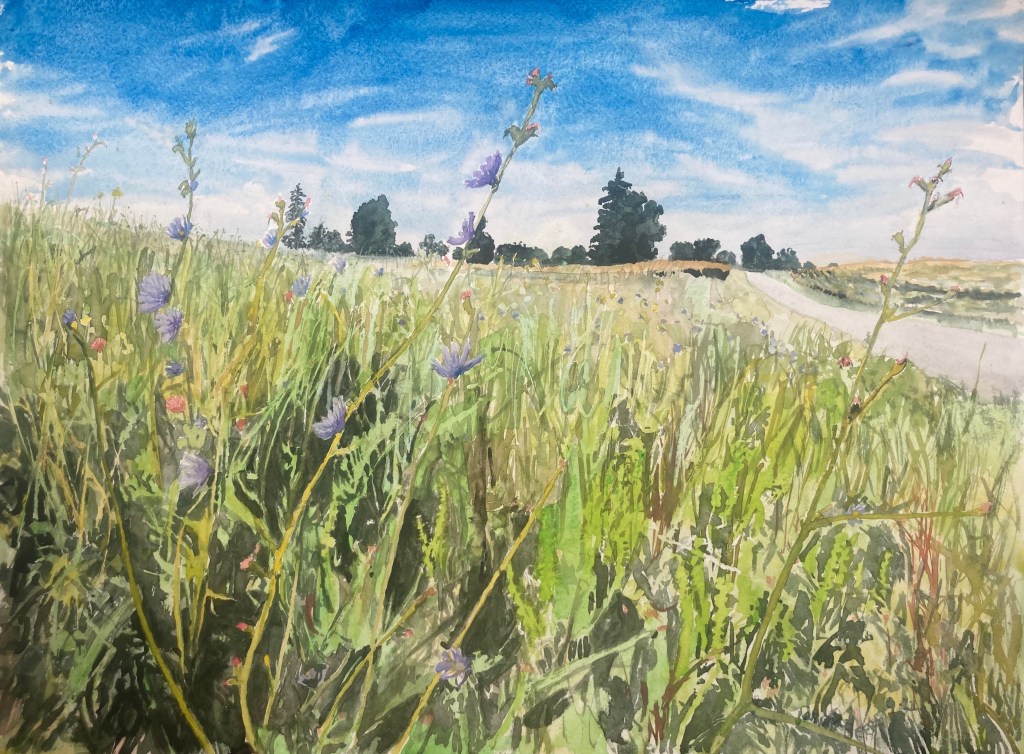 This is one of the scenes from Saturday’s Aids Ride for life. It’s just East of Ledyard and last year there was a barn standing in the distance near those trees. Tis the season for chicory and clover and asters alone the roads. I don’t know all the grasses mixed in this patch of earth but there’s many. This one is 18″ x 24″ using pencil and watercolor cotton paper. $ 175 unframed