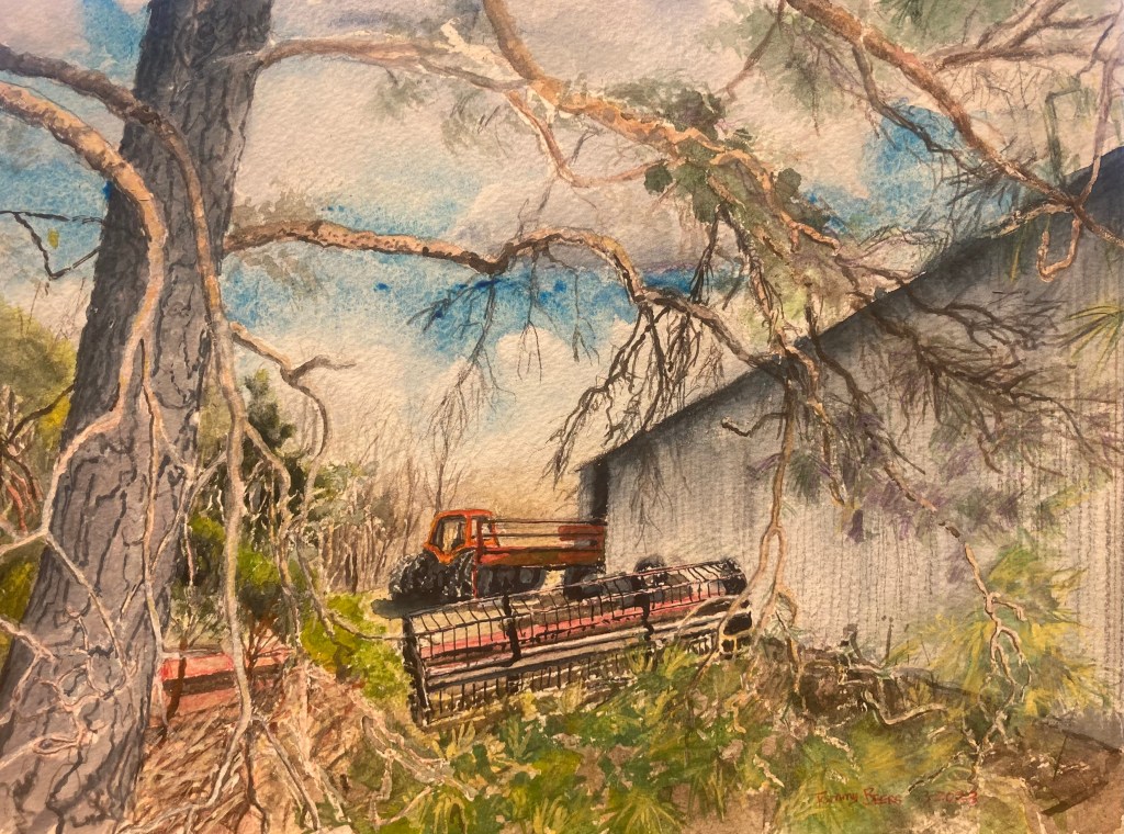 This is the farm of Jim VanVleet near Lodi. He grows organic grains on many acres. This is some of the equipment he uses, but, he says he often spends more time under his machines than in them. They all have many years on them. And he does this pretty much all on his own. It’s lonely being the only organic grower in his section of the world. We hope to use his farm as part of a grant that features rural NY. I paint and Peaches poets, riffing on the finished drawing. We’ll see what happens.