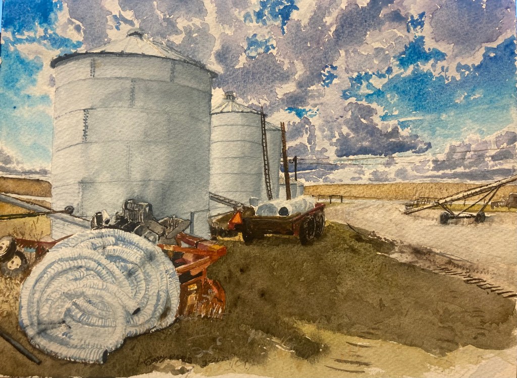 Jim’s farm has 10 silos for grain storage and here’s 5 of them. This one is 9″ x 12″ using pencil and watercolor on cotton paper.