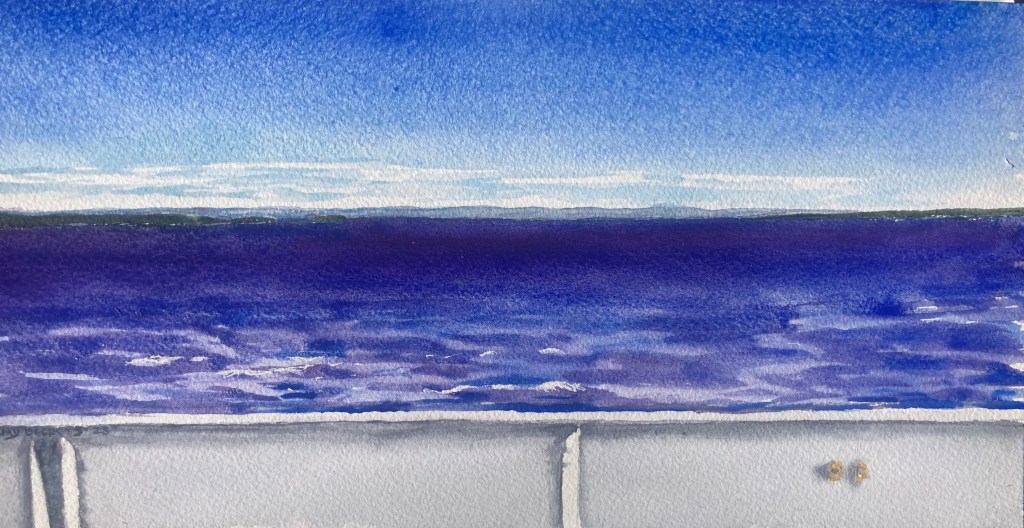 The waters took on a beautiful blue as we left Tobermory on our way to South Bay on Manitoquin Island. I had the most delightful conversation on the 2 hour ride with Ken and Melinda, a Native couple who live on the reserve on the island. So in the painting we’re looking to the East at Owen sound. On the other side of the boat is Lake Huron.