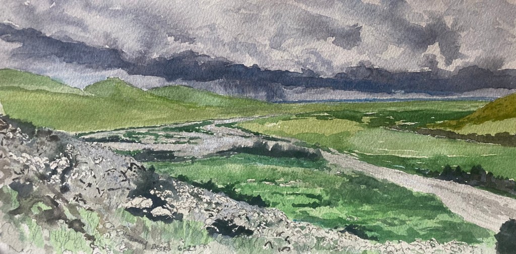 This part of Montana is normally very dry. The fields are full of rocks and sage brush. But as it’s an unusually wet spring there, the river flooded its banks and all was emerald green around it. More rain coming in too. Climate change is real. My friend Dan Geiger drove us up to this little dead end area where the road stops and one is surrounded by mountains on 3 sides. This is 5.9″ x 11.8″ using pencil and watercolor on cotton paper. $50 unframed.