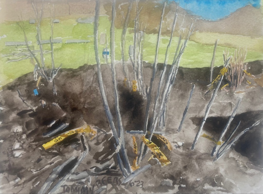 Here’s one more from Akiva’s little nursery. These are probably berry bushes, something that people or birds like. The nitty gritty of the business, this and chestnut trees. It’s 6″ x 8″ using pencil and watercolor on cotton paper. $50 unframed