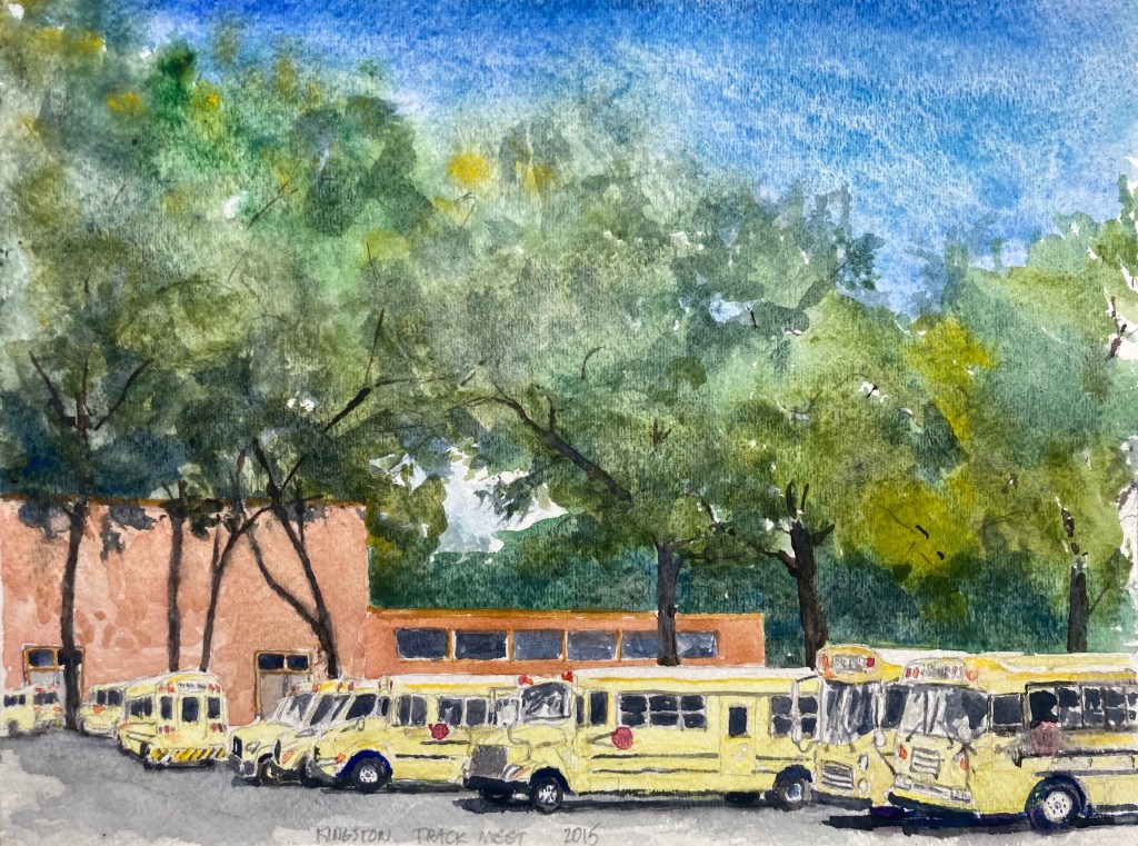 I started this painting years ago when visiting my daughter n Kingston. Finally got around to an attempt to finish it. the buses were done plein aire back then and the rest is new. It was a track meet on a Saturday morning and I found all the yellow irresistible.