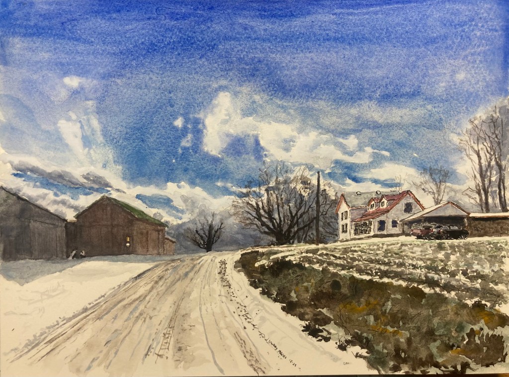Here’s some of the first snows of our season in Central NY. This is in the hills south of Van Etten. I loved that the next clouds coming were full of more snow. This is 9″ x 12″ using pen, pencil and watercolor on high quality paper. $85 unframed