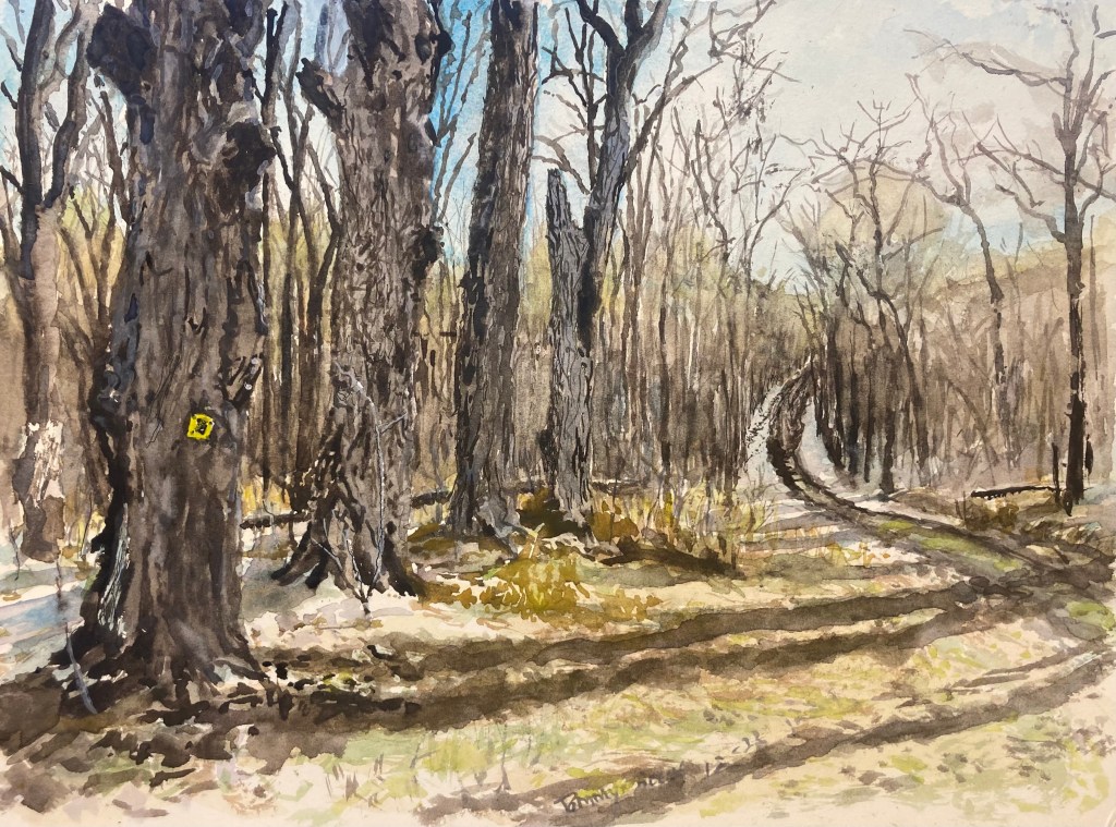 The road was just passable for my vehicle. I find these old maple trees quite fascinating and have tried to capture them a few times as they appear along this section of the road. there’s some old foundations up here and an old cemetery, quite overgrown. This is 9″ x 12″ using pencil, pen and watercolor on satin grain Waterford paper. $85 unframed.
