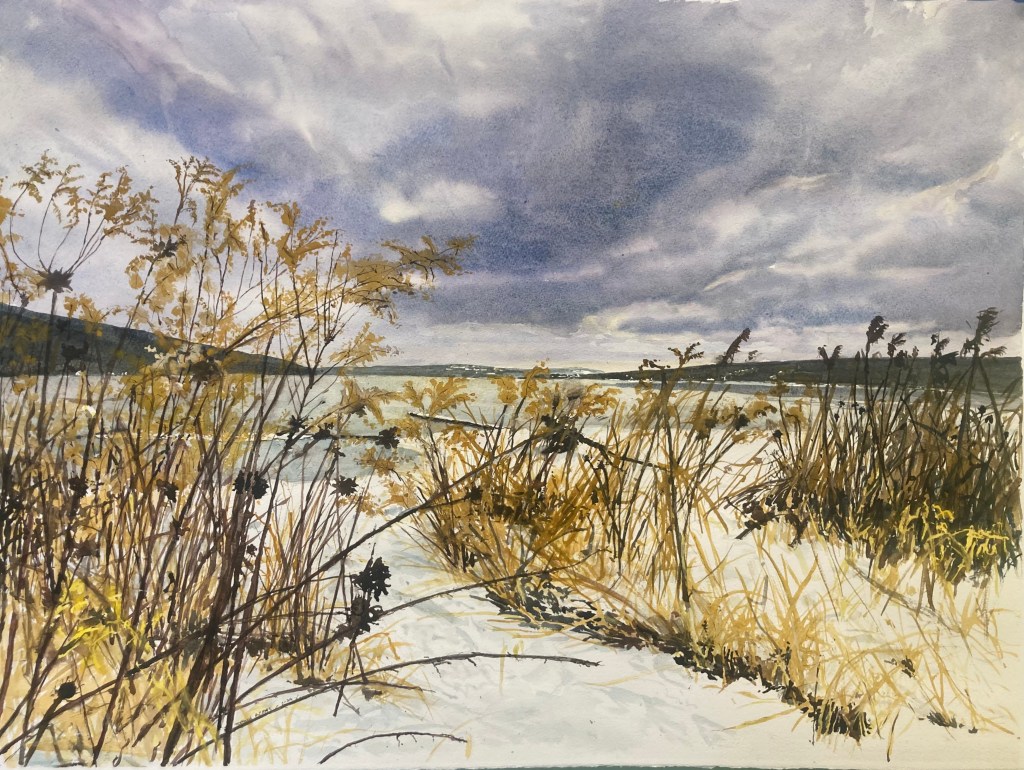 This is a big one, 22″ x 29″. It sat on the desk for almost 3 weeks as I worked on it. This is our winter weather here in Ithaca, NY. It’s the foot of Cayuga Lake where the shoreline keeps moving inland. land. All the trees along this shore have been felled by the ever advancing waters. It’s slow but sure. This will be framed soon as I have found some large fancy frames but unframed….$225.