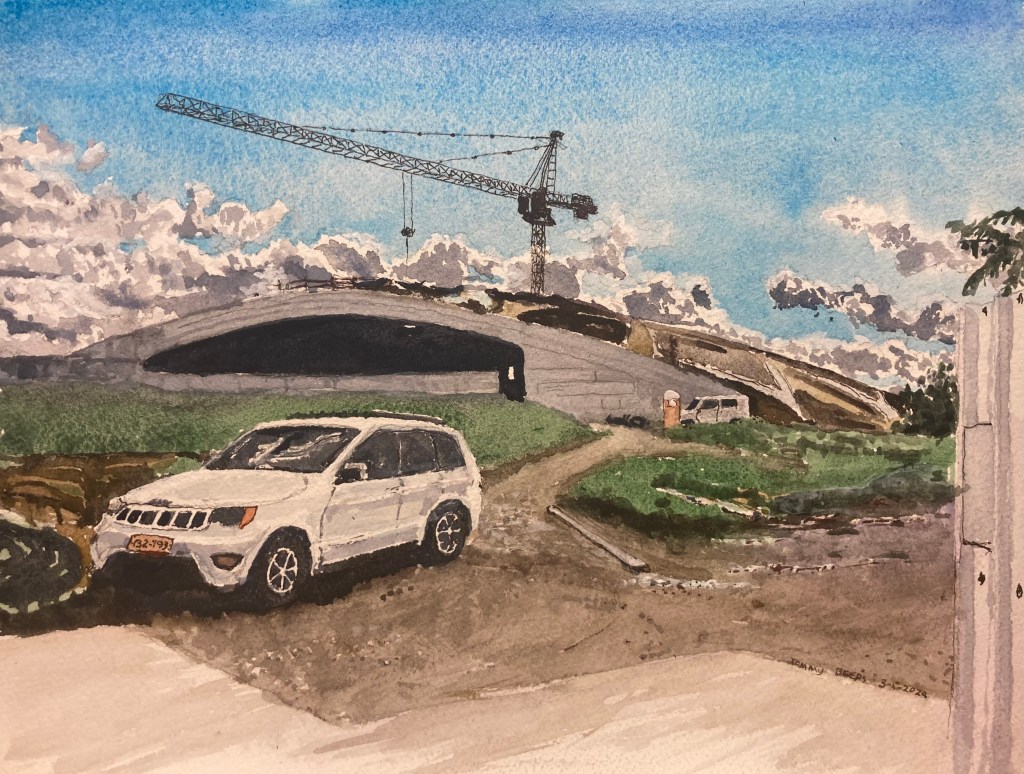 Here’s one more from the Pilgrimage. There’s beautiful gardens and buildings at the Baha’i World Center and I wanted to give some attention to the process and to the workers. This one is 9′ x 12″ using pen, pencil and watercolor on cotton paper. $85 unframed