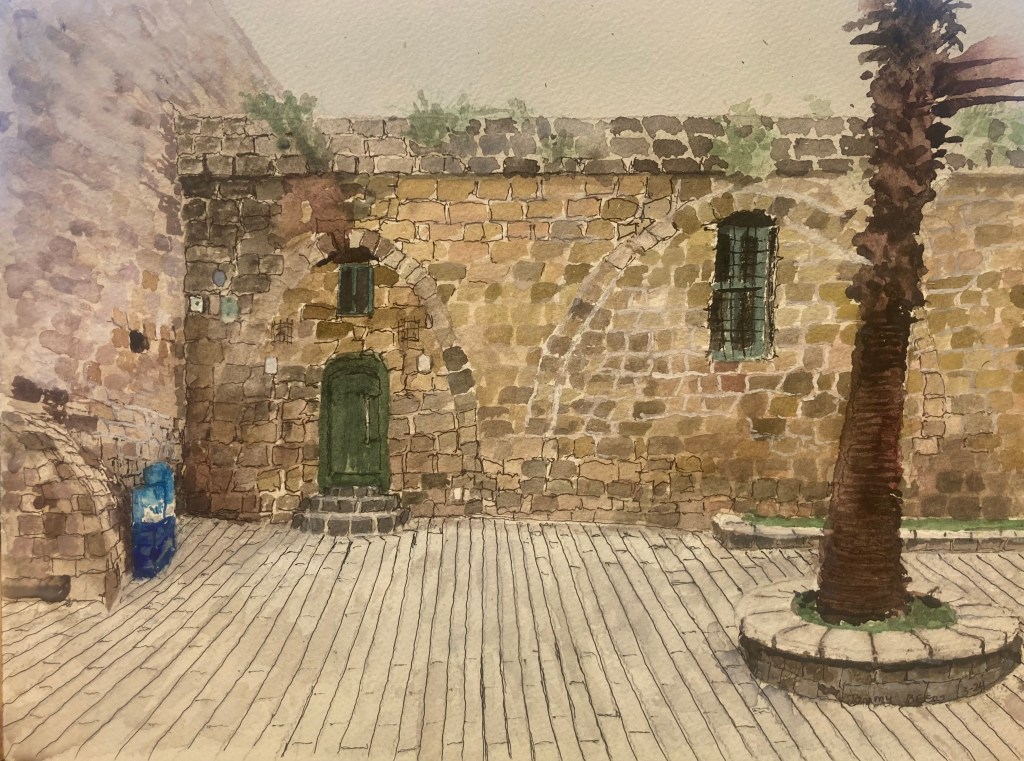 I’ve said I would do a painting a day during our fast period. This one took 3 days. Does sitting and staring at the piece count was working on it? I’m getting other things accomplished though. In the ancient city of Akka (Acco) there’s a green Mosque and across from it stands this doorway, also painted green. All stone and tile are the pathways and streets of the city. Someone painted a mural of the sea on the boxes on the left. I want to know what’s behind the old door. This is 9″ x 12″ using pencil, pen and watercolor on cotton paper. $ 85 unframed.