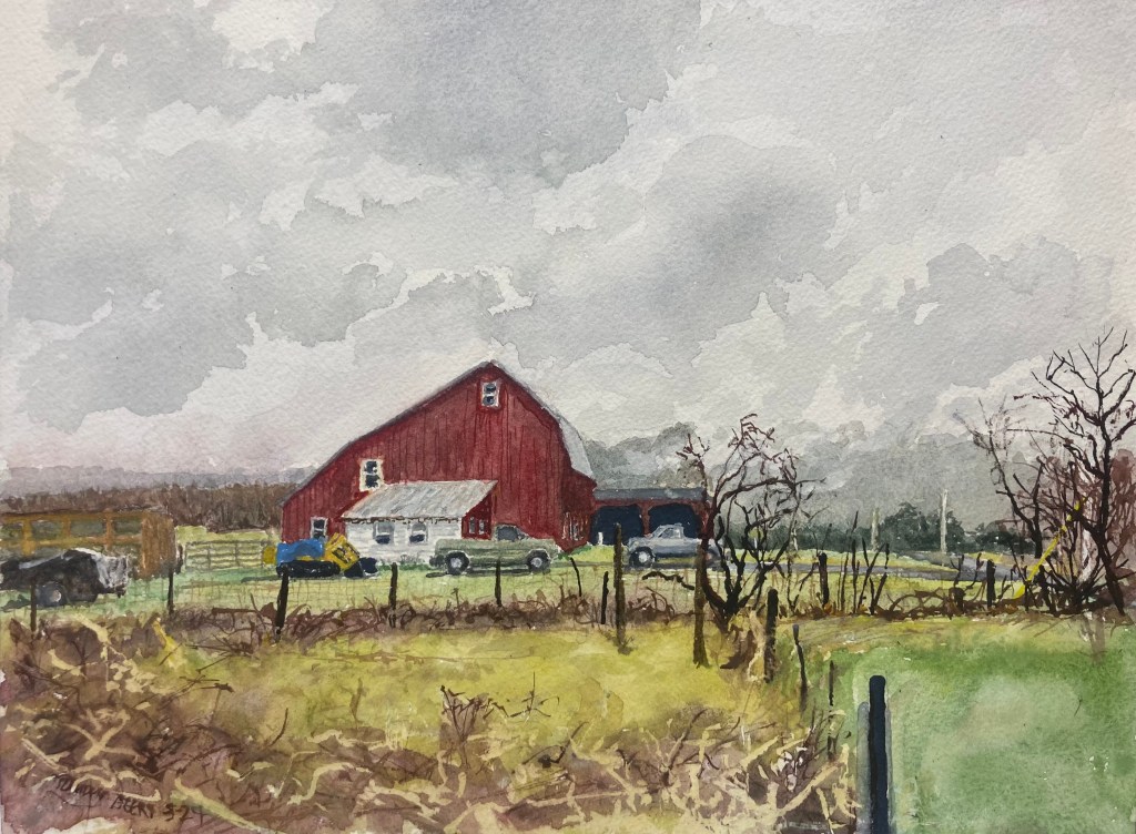 I visited my friend Krishna who lives on Belle School Rd. and this is the farm next door. I loved the foggy morning and the winter colors. It’s 9″ x 12″ using pencil and watercolor on cotton paper. $ 85 unframed.