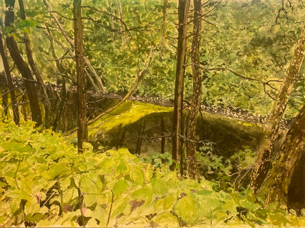 Finally finished this one. It was a phenomena found along the creek where a log had backed up the water and the algae was a spectacular color. We try to capture it in all its glory. This is 9″ x 12″ using pencil, pen and watercolor on cotton paper. $85 unframed
