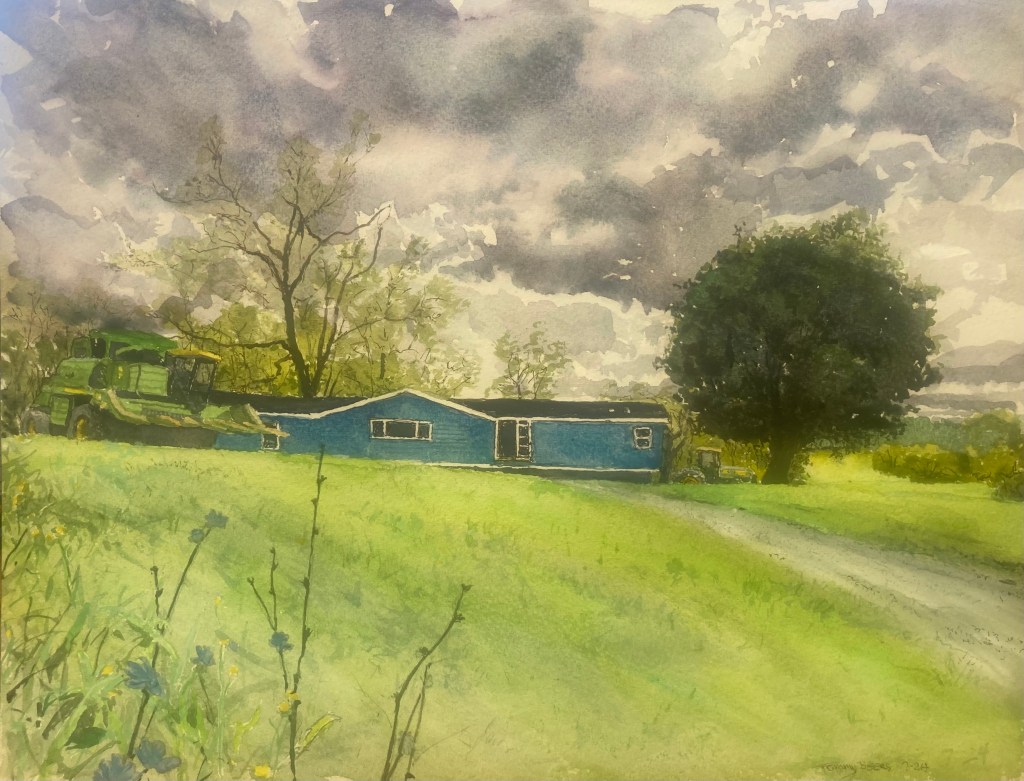 From a bike ride on Salmon Creek Rd. comes this combine ready to go to go to work. It’s Springtime and everything is so green. I cheated and added some summer chicory to break up the expanse of lawn. This is !2′ x 16″ using pencil, pen and watercolor on wool paper made in St Cuthbert’s Mill since the 1700’s. It’s really nice surface and strong too. $ 120 unframed.