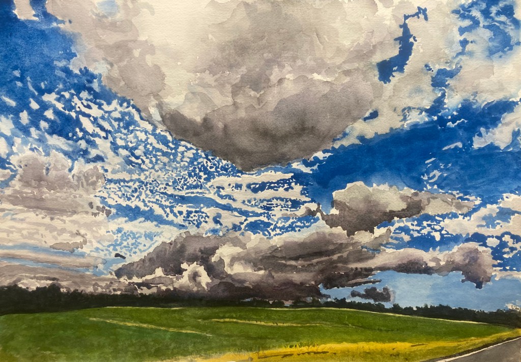 Yesterday I managed to ride around Cayuga Lake and what a day for clouds it turned out to be. This was the first photo I took and It’s on Rt 89 North of the Interlaken connecting road. I’m looking at my cloud chart and can’t quite decide how to name this configuration. Cumulonimbus for big lower level and cirrocumulus stratiformis for the upper levels. This one is 20″ x 14″” using pencil, pen, gauche and watercolor on cotton paper. $130 unframed but it too will be at the artists market on August 9th from noon till 7:30. Please come by and see what been happening in the arts world of late.