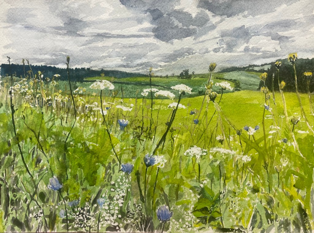 This must be the 10th time I paint this particular scene at the top of Straights Corners Rd. The wildflowers are out in force these days and the fields with twin trees behind them hold a great allure for me. Big gray skies but this time I went for the foreground. I was riding with Dave I on this particular favorite route. We are readying ourselves for the Aides Ride around Cayuga Lake on the 7th of September. We’ll be set I think. My guess is we got between 60 and 70 miles last monday. This one is 12″ x 16″ using pencil, watercolor and a touch of gouache on cotton paper. $85 unframed.