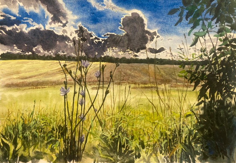 Here’s one more from a ride earlier this week, Monday, Labor Day, to be exact. To continue on with being exact, this was seen on Podunk Rd. still early in the day. Dave and I rode around Cayuta Lake and then, he back to T-burg, and me on to Ithaca. This took me 3 days to complete. It’s 14″ x 20″ using pencil, pen, watercolor and a touch of gouache on cotton paper. $125 unframed SOLD
