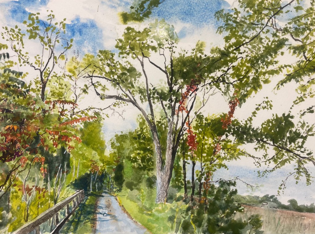 This is our wonderful biking trail to T-burg from Ithaca. The colors were just beginning to come out on this particular section of the trail. Sumac and Virginia Creeper are the earliest except for maybe a diseased or stressed maple tree. This is 12″ x 9″ using pencil, pen and watercolor on cotton paper. $75 unframed.