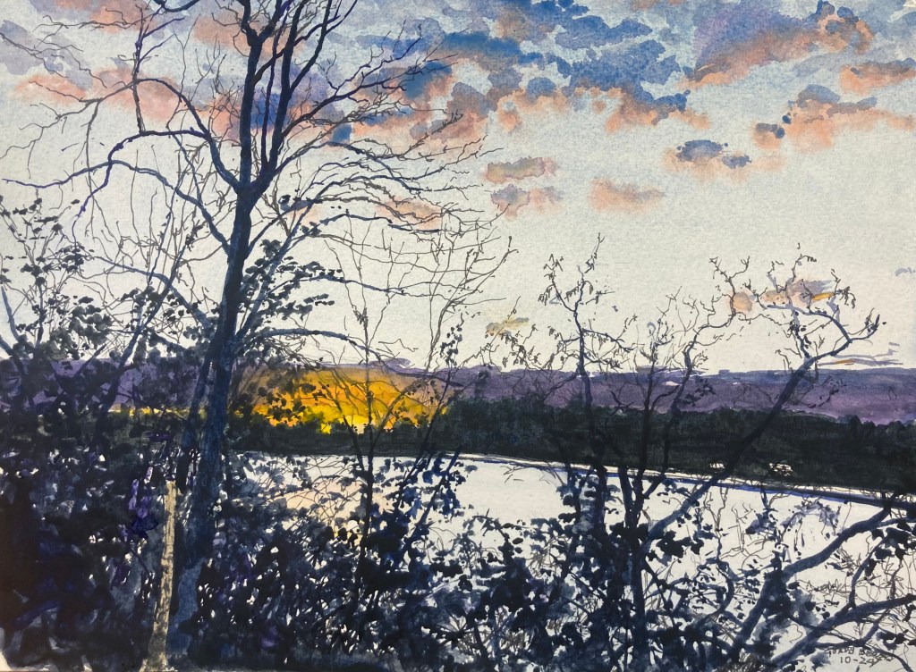 Once again I rode home from Rochester last Sunday, slept under a roof in Macedon park and starting out early Monday morning, this was the greeting from sunrise. This part of the canal is like a small lake…it’s quite wide right here. I passed the spot where I took a fall last October and could plainly see why I fell. So no more riding at night for good while. It poured and thundered on Sunday night but the structure did its job. I was warm and dry come morning. A slight drizzle most of the morning kept things cool and a tailwind later in the day was most welcome. 8 hours in the saddle and I did maybe 80 plus miles on Monday, 23 on Sunday afternoon. A couple of friends are contemplating riding from Buffalo to Ithaca this fall along the canal as much as possible. That will be fun. Maybe the Rochester friends will join us as we make our way thru your area? This is 12″ x 9″ using pencil, pen and watercolor on cotton paper. $75 unframed.
