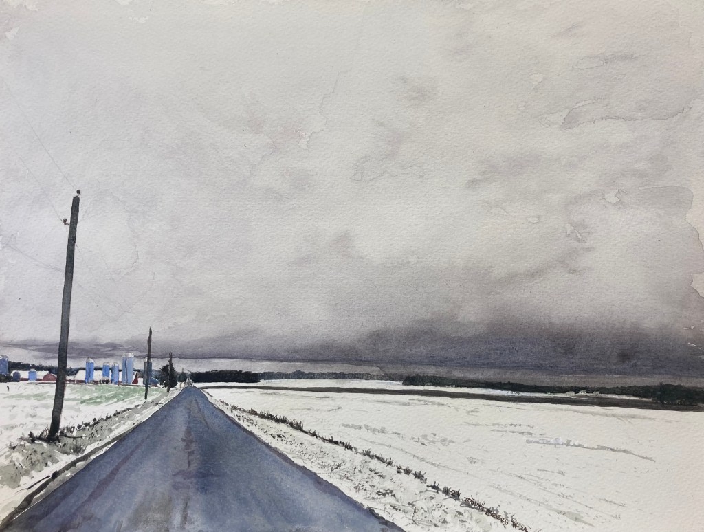 Here’s the first snow in our area. And this is the same spot of my last painting o Covert-Lodi Townline Rd. I just happened to be out there buying a turkey at the Countryside market, an Amish store. You can’t see the lake today but the farm is still in view. This is 16″ x 12″ using pencil, pen and watercolor on cotton paper. $125 unframed