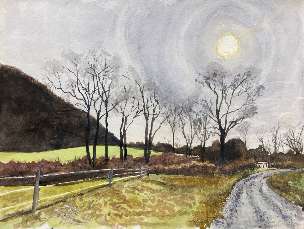 I visited a horse farm and thought the shapes were quite interesting. I didn’t realize that there was a sun dog hidden in there. Faint but here it is. 12″ x 9″ using pencil , pen and watercolor on cotton paper. $75 unframed.