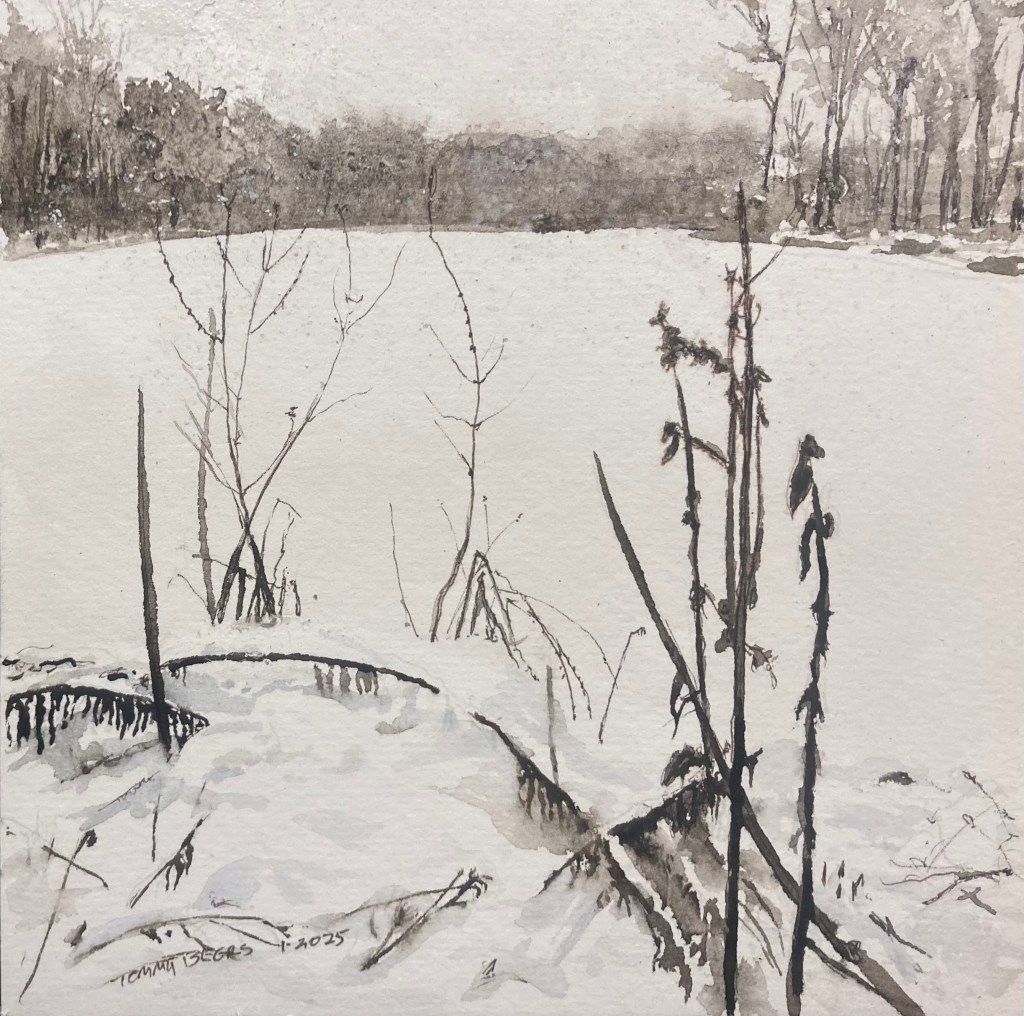 A recent walk where the dogs can run free brought me near this pond. It was where the first colors of the fall began up here on Connecticut Hill, all along its edges. Quite a difference today with everything frozen. This is 8″ x 8″ using pencil, pen and watercolor on cotton paper. $65 unframed