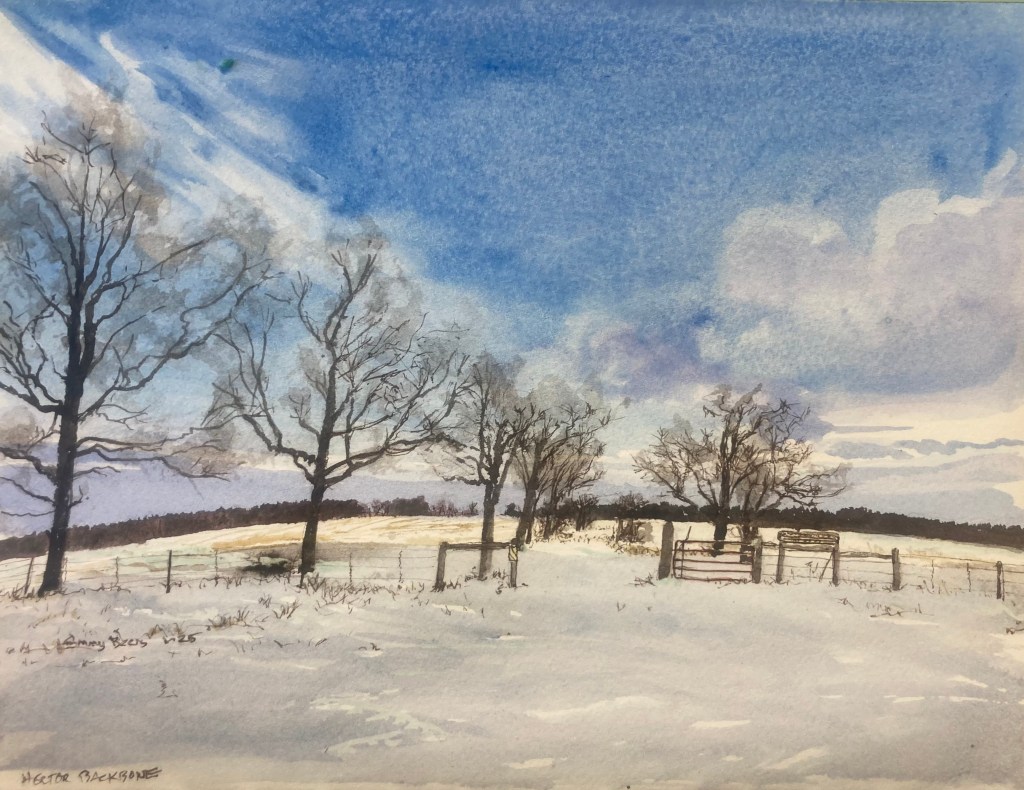 Here’s another from our first day of sunshine in weeks. And we chose a good path that day as we got lots of sun in the open fields. This is 12″ x 9″ using pencil, pen and watercolor on cotton paper. $75 unframed