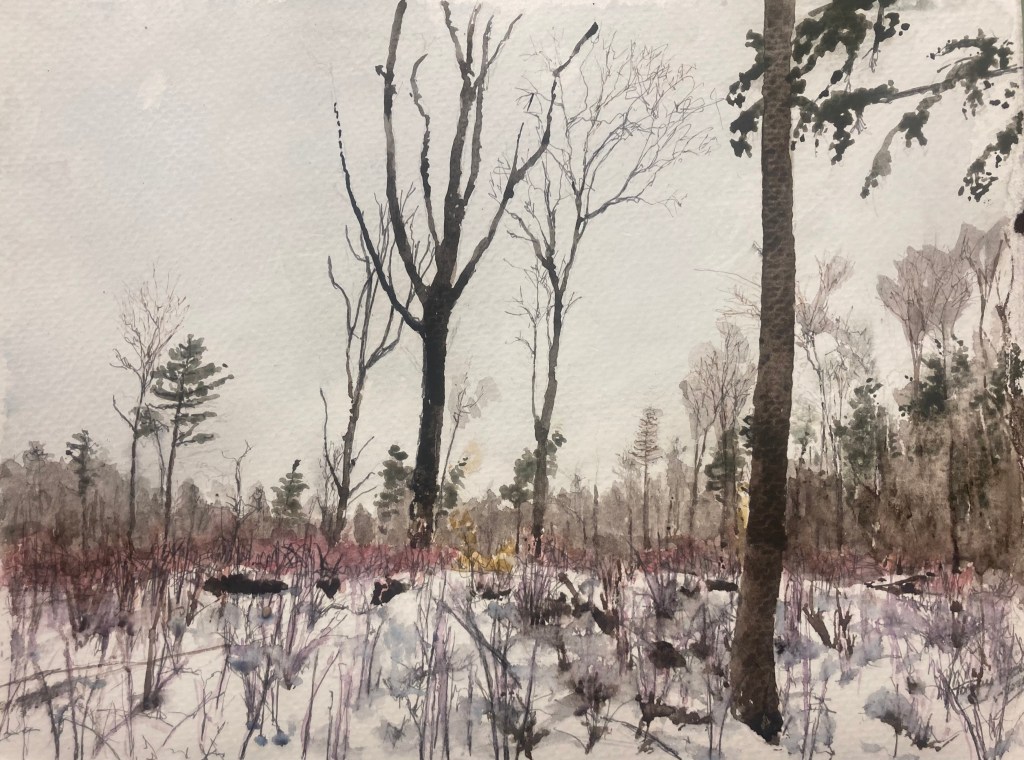 So here’s another blemish in the Connecticut Hill area…forest management they call it. I guess I don’t understand what’s happening here. Cut down a bunch of trees and leave some. What grows in first is blackberry bushes, lots of thorns. I must decide to trust the managers. It’s hard and it’s ugly after they move thru. There is a bit of color in winter though. 12″ x9″ using pencil, pen and watercolor on cotton paper. $75 unframed