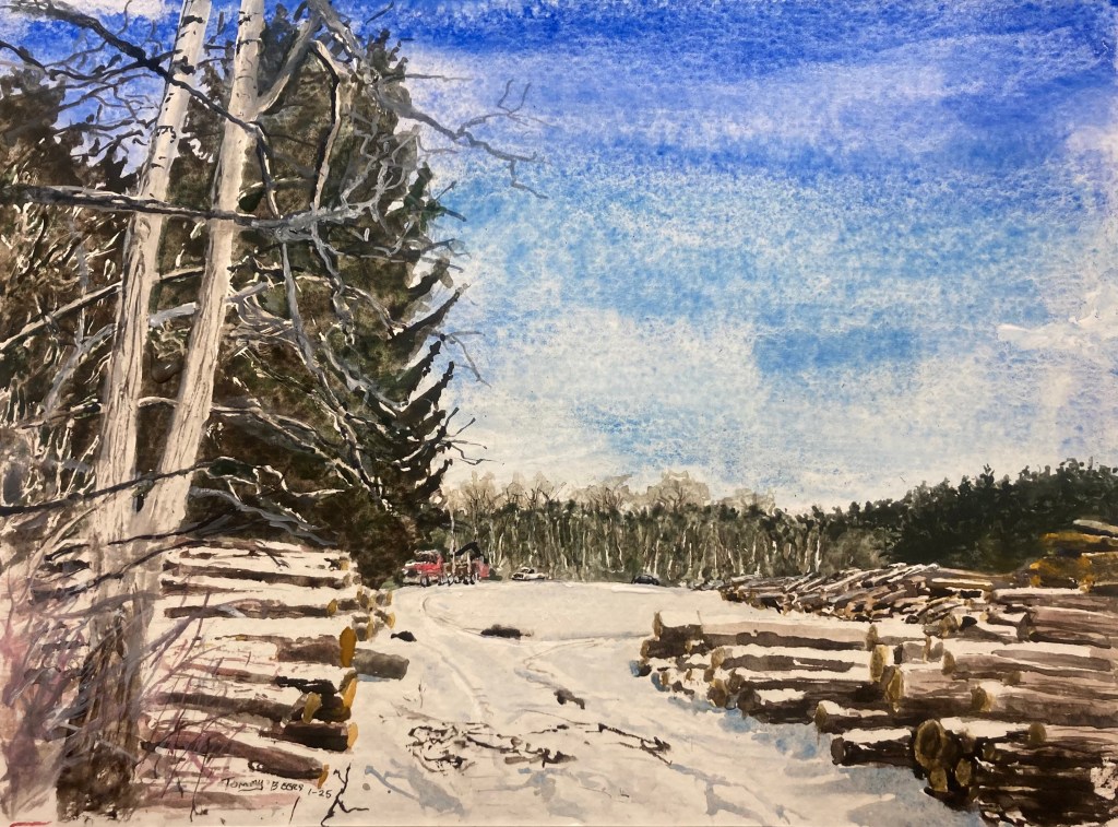 Hi Tommy – Yes – the composition is very interesting, the complexity growing as I looked at it longer. It took me a while to see the tiny red truck in the distance. You’ve really developed the skills of creating depth perception. Those distant evergreens on the right – with the tree tops against the sky – so far away. And the truck path going around the field, subtly curved in a painting of bold straight lines. Engaging and sad too because the logs are so dominating as the subject. – Sara