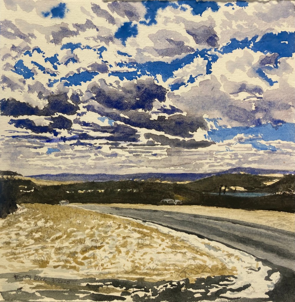 The FLT comes out up here on top of Slatterly Hill Rd. and this is the view that greets one. That’s Seneca Lake down in the valley. 8″ x8″ using pencil, pen and watercolor on cotton paper. $65 unframed.