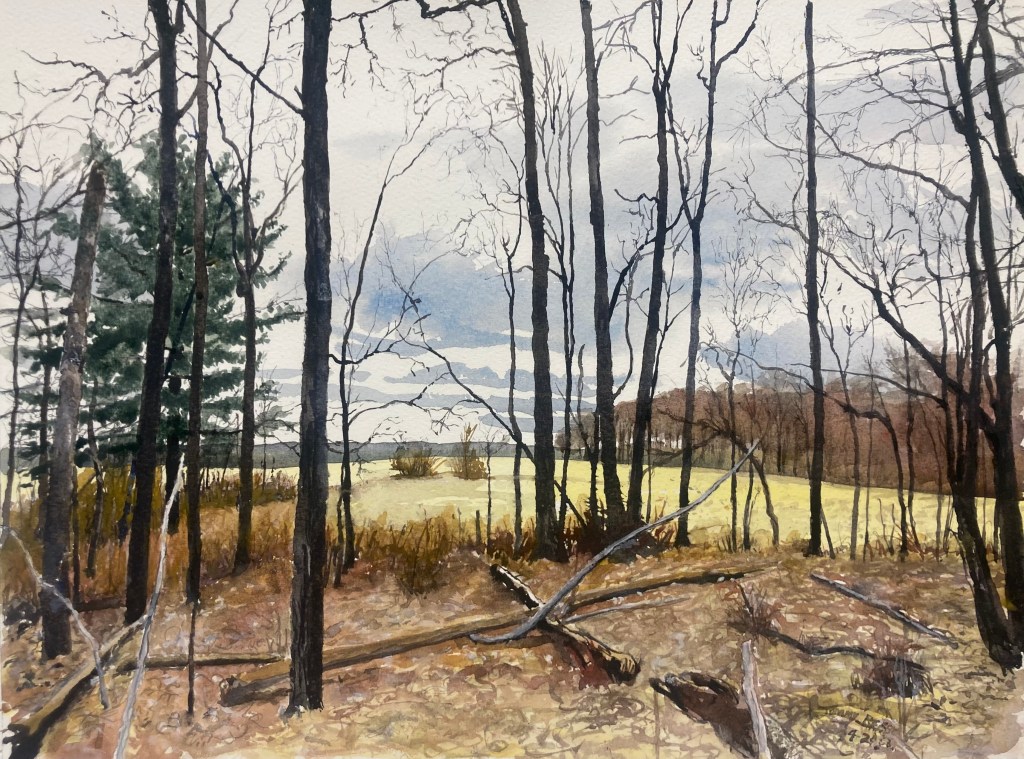 From a recent stroll thru the Kingsbury Preserve on Jersey Hill Rd. comes this portrait of the fields at the Wood’s Edge. It’s a lovely walk, of maybe a little over an hour…2.6 miles maybe. I’ve been there right after the tornado hit the woods many years ago and it was an absolute mess. Now it’s very pleasant and I must say that I’ve gone in with an ax and cleared some trees from the pathways. A chainsaw also has been there recently and I was glad to see the bigger trees were removed using it. My thanks to the sawyer. This is 16″ x 12″ and uses pen, pencil and watercolor on cotton paper. $100 unframed. But I painted this size to fit in some wonderful found frame so…when it’s placed therein it’ll cost a bit more.