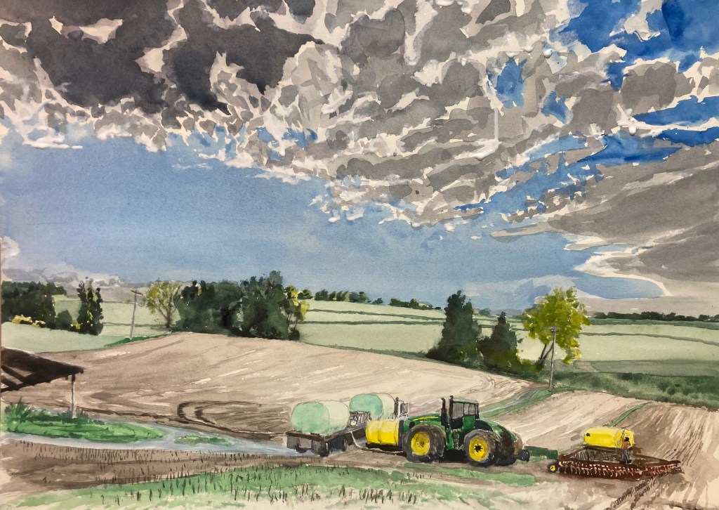 This is the second time I’ve tried this particular scene. And things are better with practice. 20″ x 14″ using pencil, pen, gouache and Daniel Smith watercolors on Waterford 130# paper. $150 unframed but it’ll get into the August 9th Artists Market here in Ithaca along with other work done in the past year.